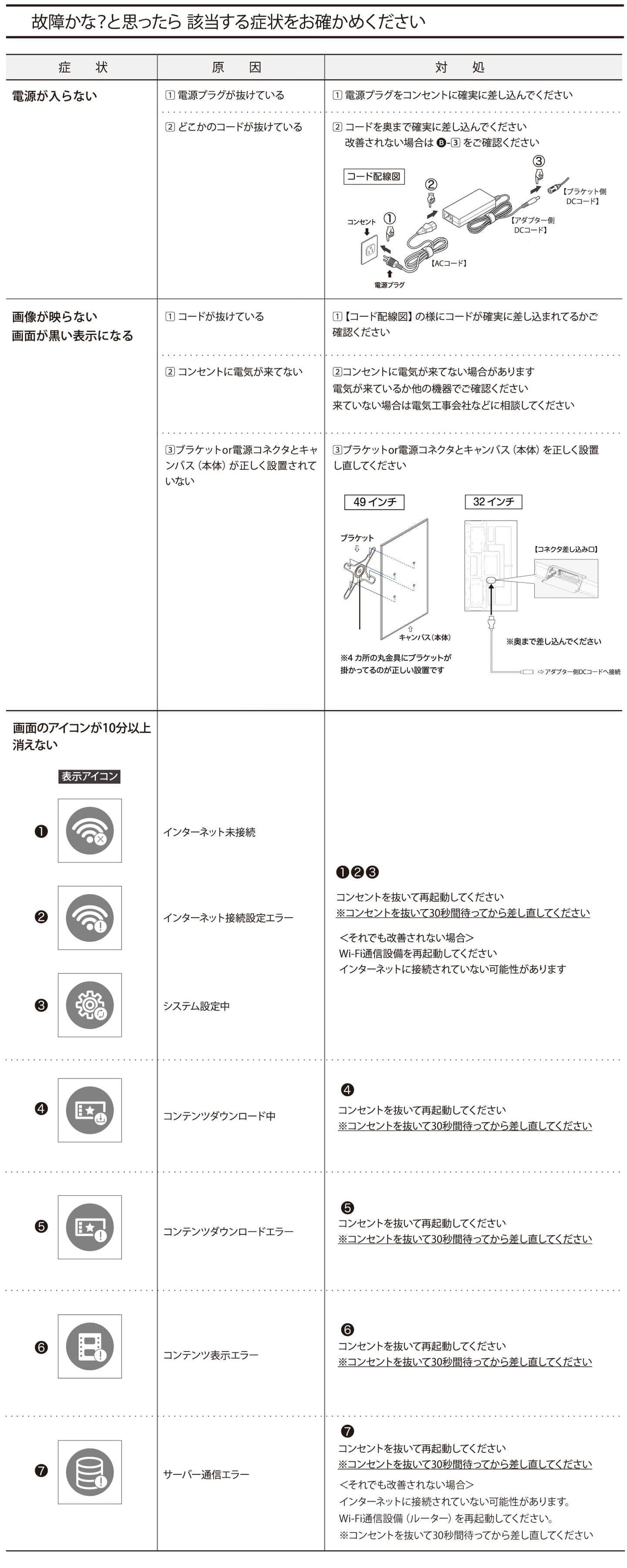 デジタルキャンバスに異常が生じた場合、以下から症状をご確認のうえご対応ください。